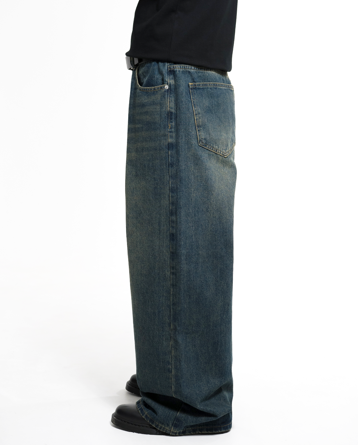 The baggy silhouette, widening from the waist down to the hem, creates a relaxed feel and a street-inspired vibe.