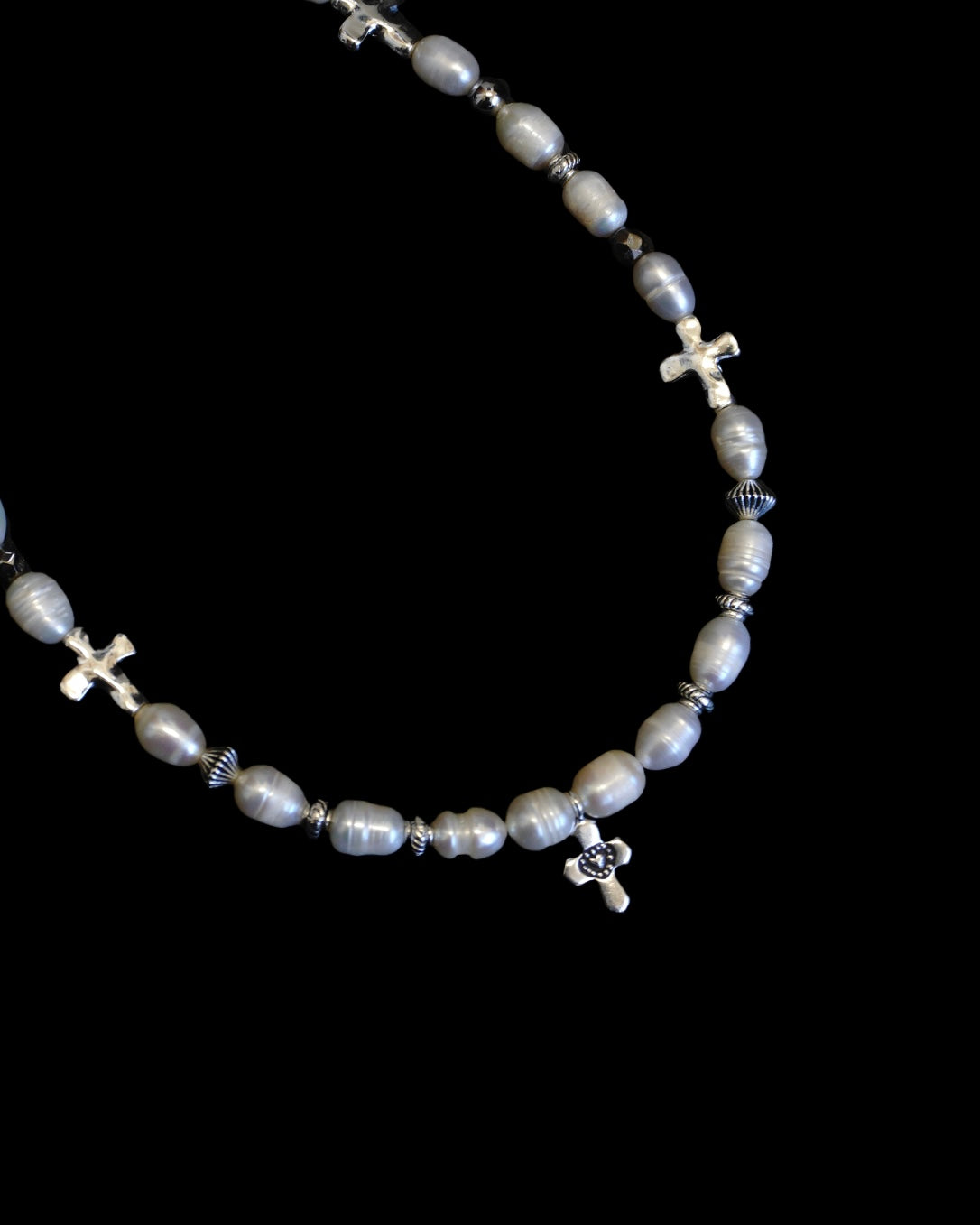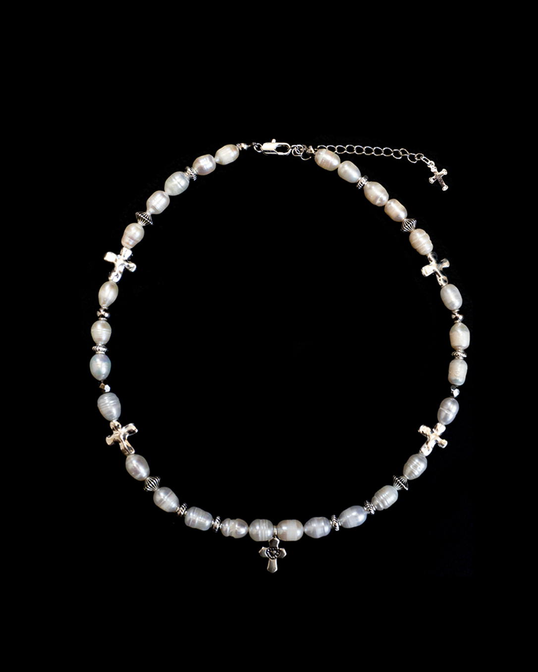 自然を敬い、霊を畏れ、正直、誠実を美徳とする価値観を持つアジアの先住民が手で作る純度の高いシルバー95%パーツと本真珠(フレッシュパール)を使用したネックレス。
