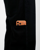The double back pockets combine functional detailing with practical storage, securely holding phones and small essentials.