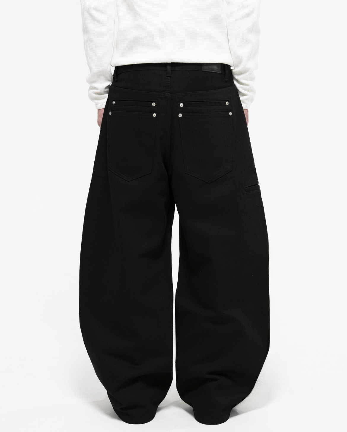 右脚のサイドポケットと背面のダブルバックポケットは、ギミック感と実用性を兼ね備え、携帯や小物をしっかり収納できる設計。